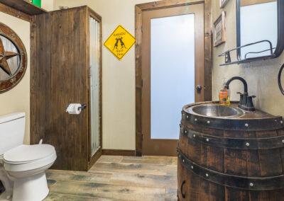 commercial size cooktop/grill with exhaust venta hood, a bathroom with shower, and a corrugated