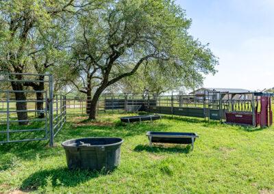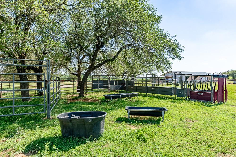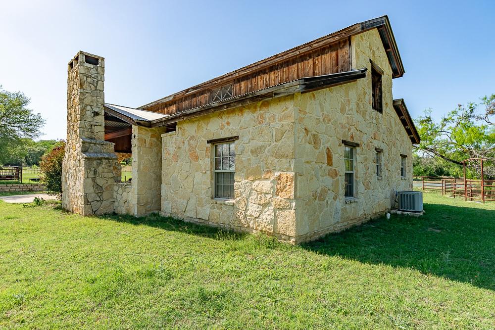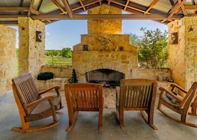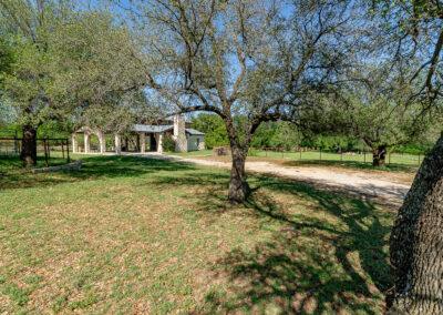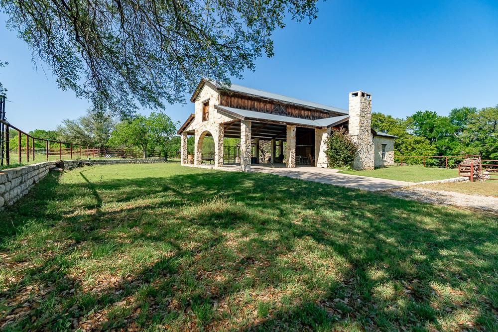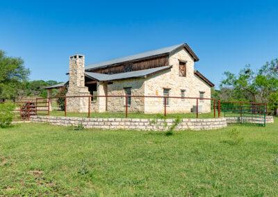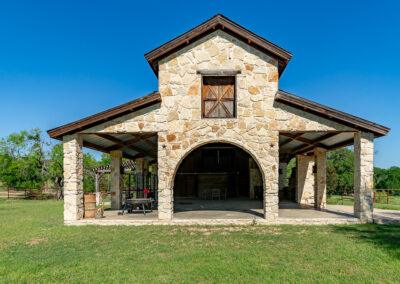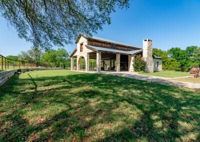 A large stone pavilion with stone columns, a massive wood-burning fireplace, and a two-level vaulted metal roof. One-bedroom, one-bath bunkhouse with kitchen and shower. Stone retaining walls surround the pavilion, complemented by pipe and cable fencing. A metal building provides storage for feed, supplies, and tools. Pipe and cedar-stave entry and cedar-stave fencing line Consolation Drive.