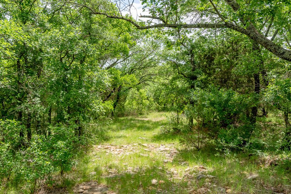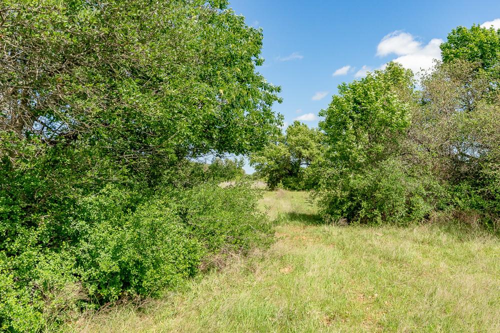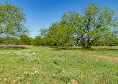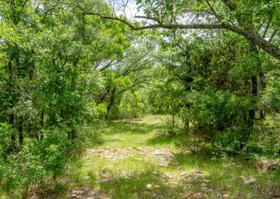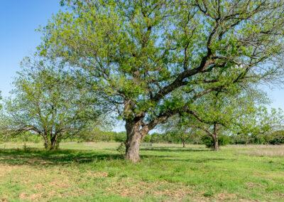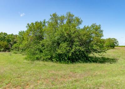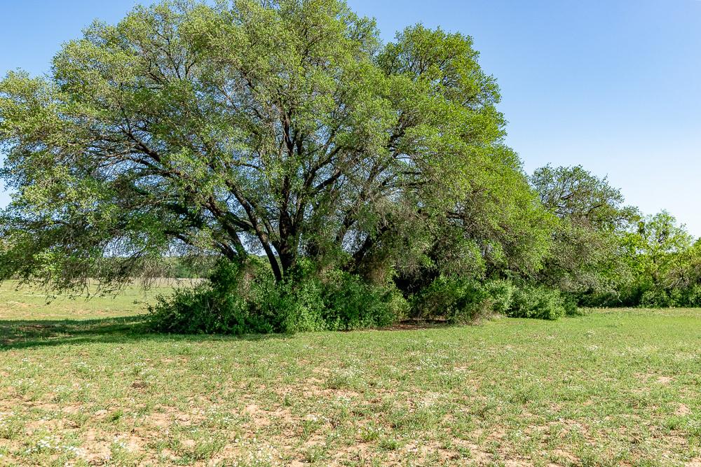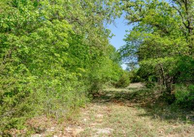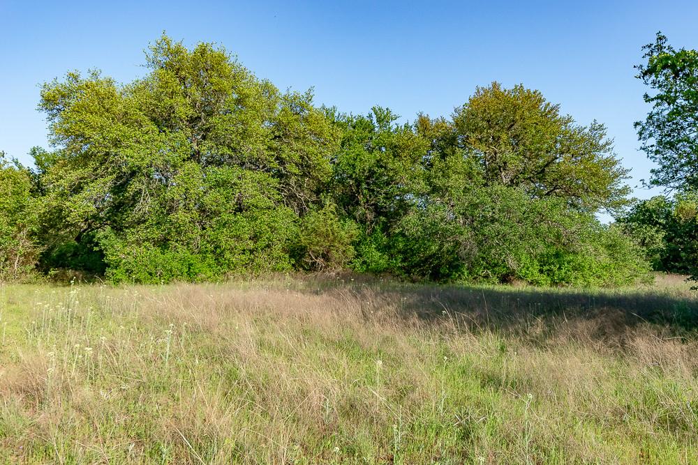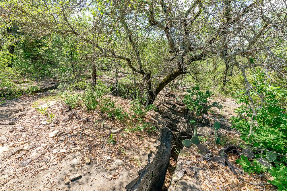 Tree cover includes live oak, post oak, elm, mesquite, cedar, pecan, Texas ash, hackberry, red oak, and other deer-browsing species. Limestone outcrops and remnants of old stone fences provide evidence of the property’s history. Prickly pear, yucca, and large limestone boulders with natural cracks can be found along the bluff.