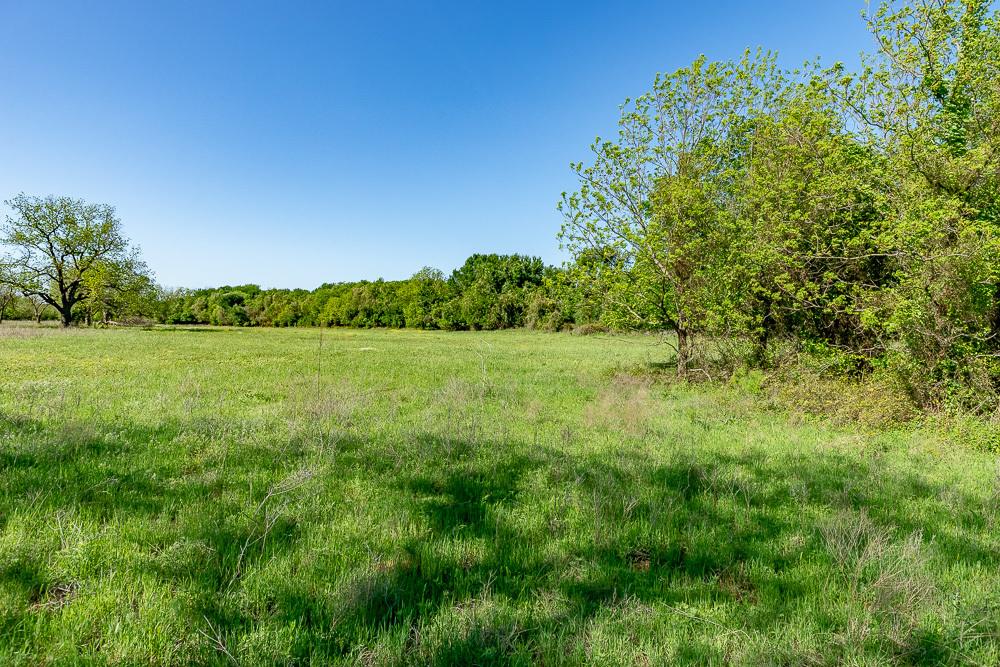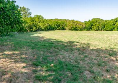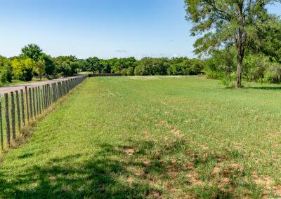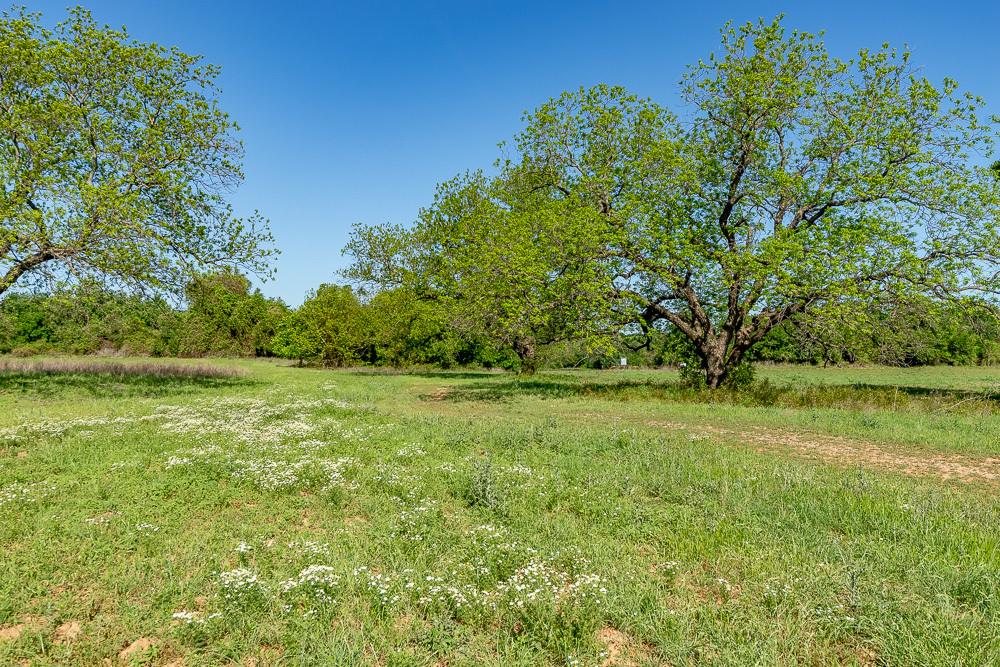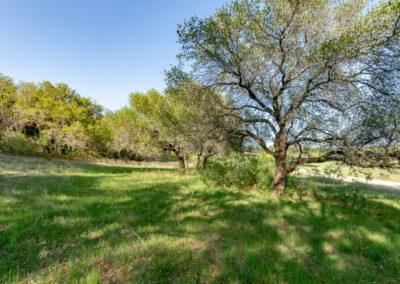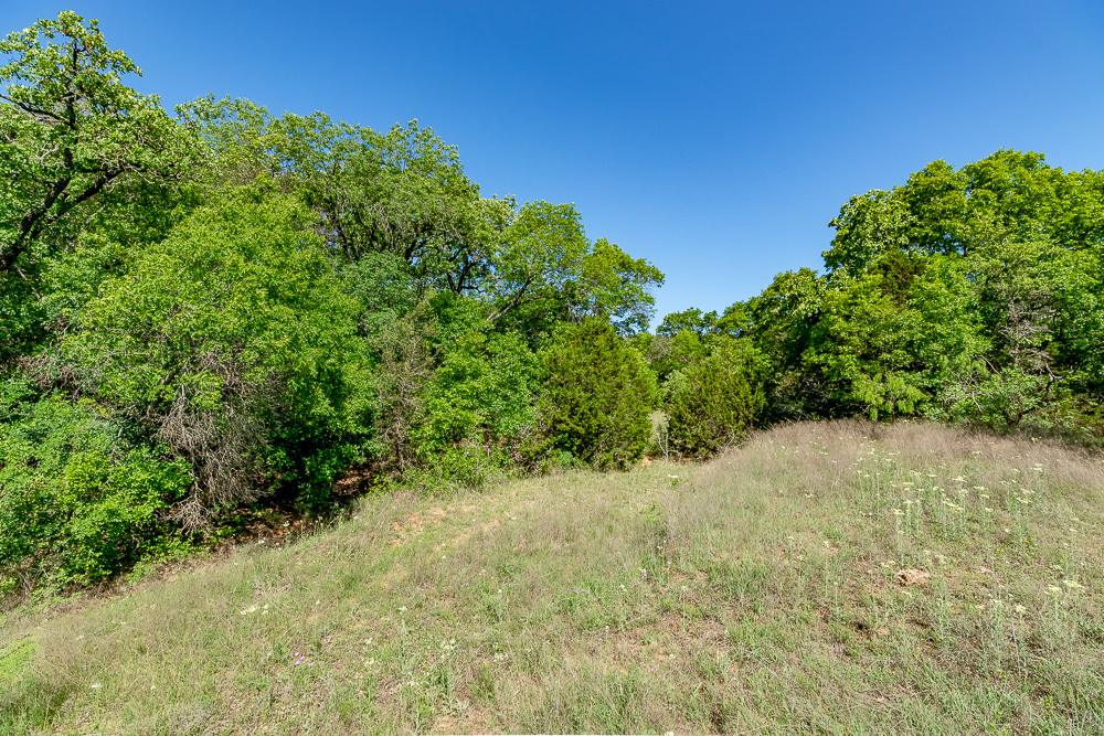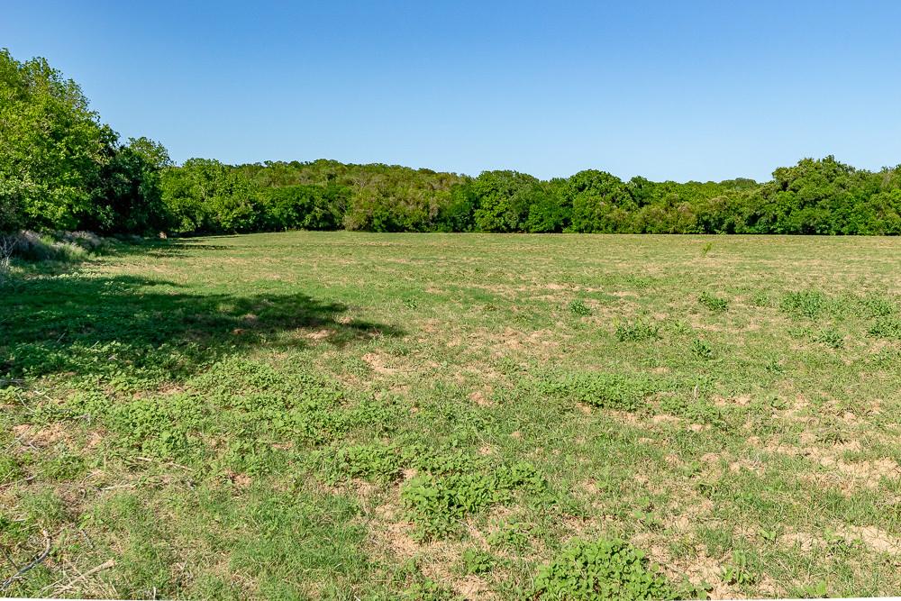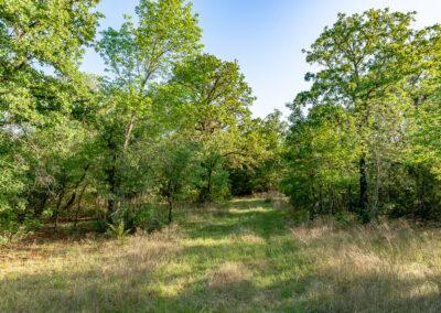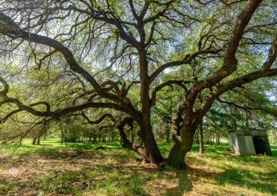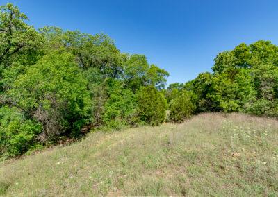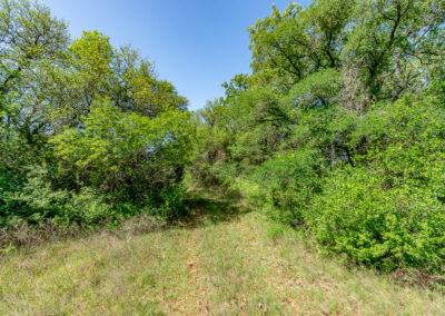 Tree cover includes live oak, post oak, elm, mesquite, cedar, pecan, Texas ash, hackberry, red oak, and other deer-browsing species. Limestone outcrops and remnants of old stone fences provide evidence of the property’s history. Prickly pear, yucca, and large limestone boulders with natural cracks can be found along the bluff.